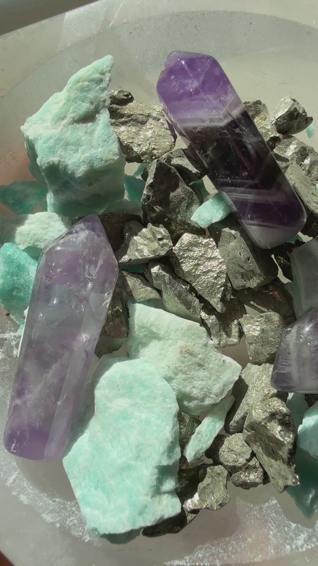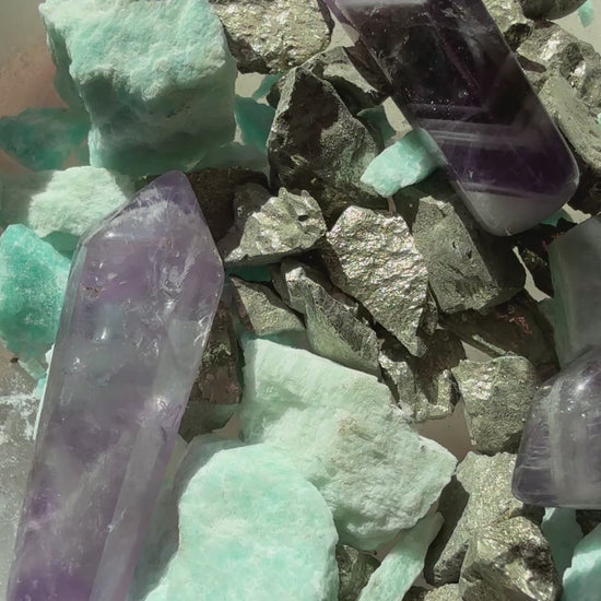 Materials: Chevron Amethyst Points, Raw Amazonite, Raw Pyrite