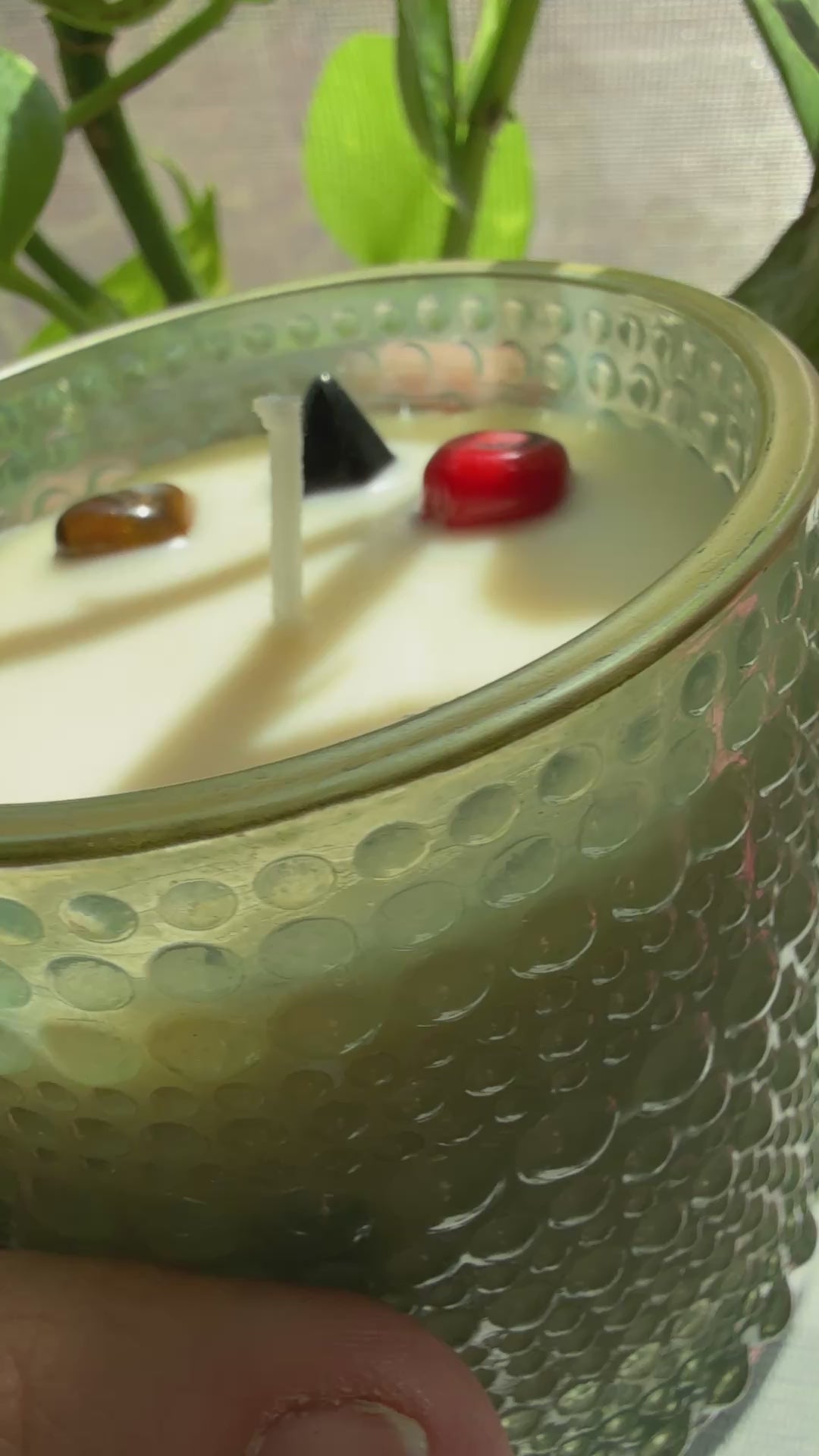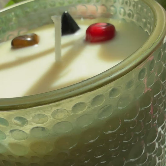 Green Crystal Energy Candle – Coral, Black Obsidian & Tiger’s Eye